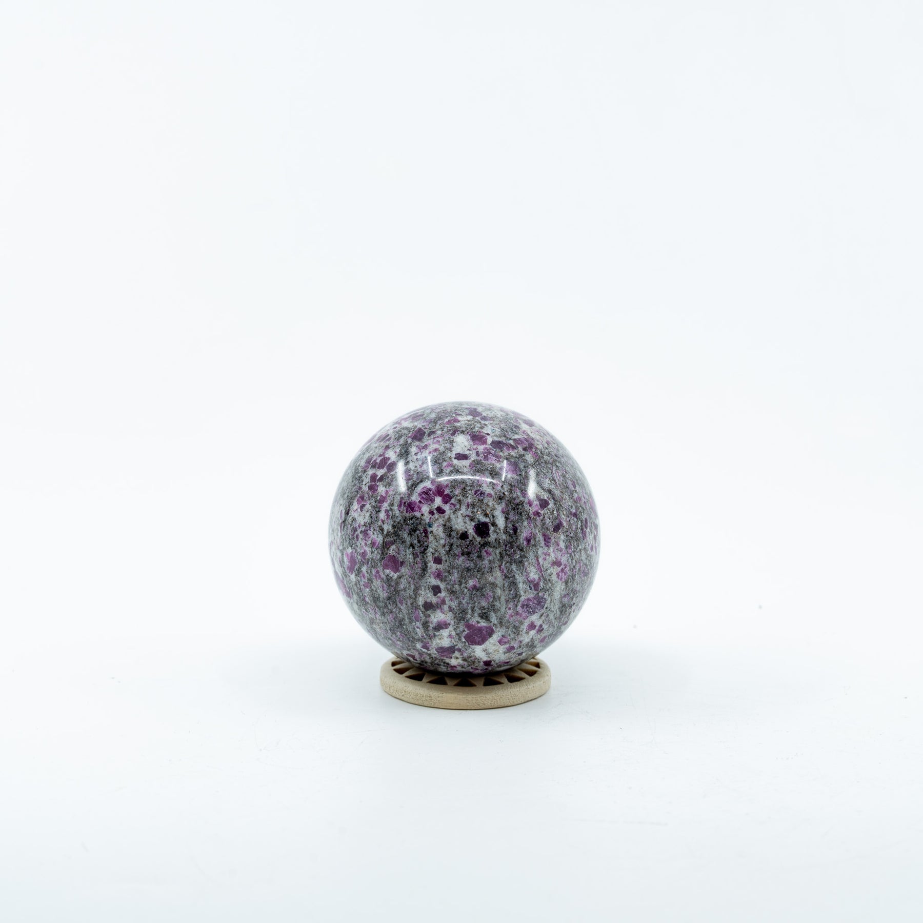 Ši įspūdinga sfera atskleidžia dviejų skirtingų energijų susiliejimą – ugnį ir šviesą. Gilūs purpuriniai rubino kristalai įaugę į šviesiai pilką bei baltą albitą sukuria harmoningą kontrastą, primenantį kosminį peizažą arba paslaptingą žvaigždžių audinį. Žiūrint į ją atrodo, tarsi rubino kibirkštys degtų ramioje šviesoje, spinduliuodamos jėgą ir tyrumą vienu metu.