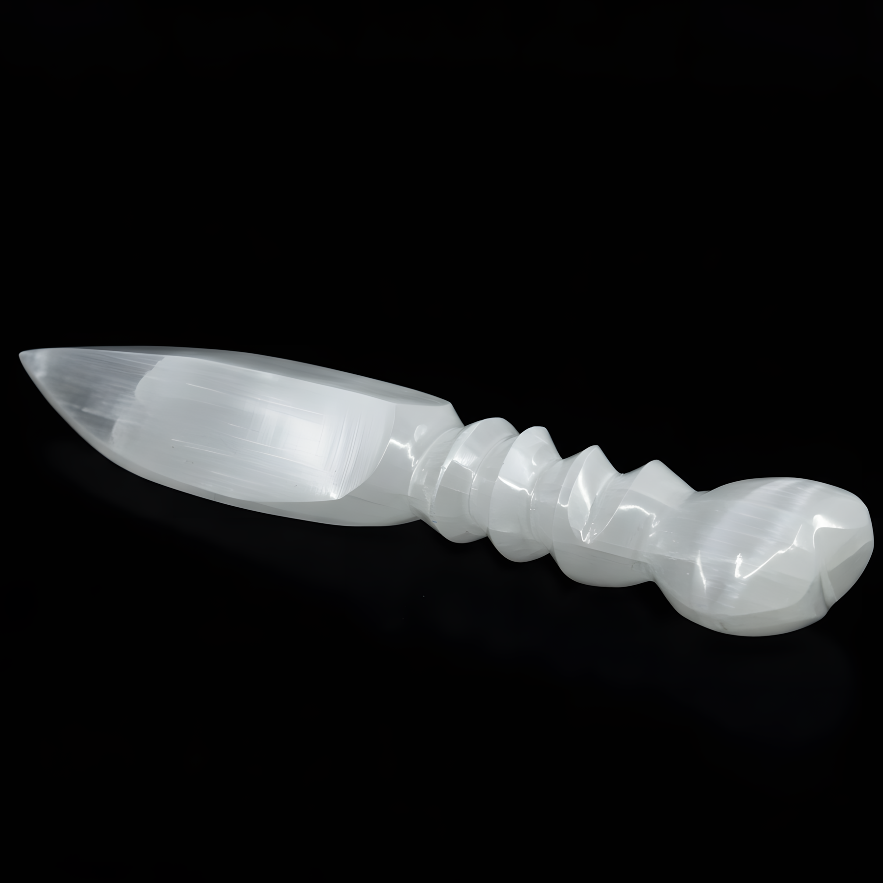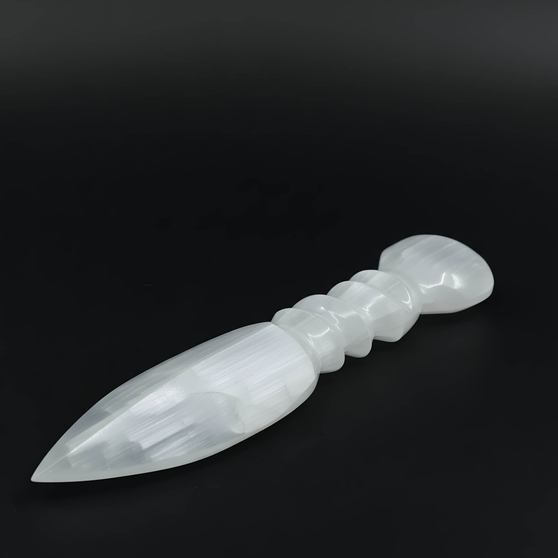 Šis peilis iš natūralaus selenito – šviesos ir tyrumo kristalo – simbolizuoja energetinį apsivalymą ir dvasinį aiškumą. Jis nenaudojamas kaip fizinis įrankis, o skirtas ritualinei praktikai, energetinėms sesijoms ar kristalų valymui.Selenitas nuo seno laikomas angelų akmeniu, gebančiu išsklaidyti tamsą, atstatyti harmoniją ir sustiprinti ryšį su aukštesnėmis vibracijomis.