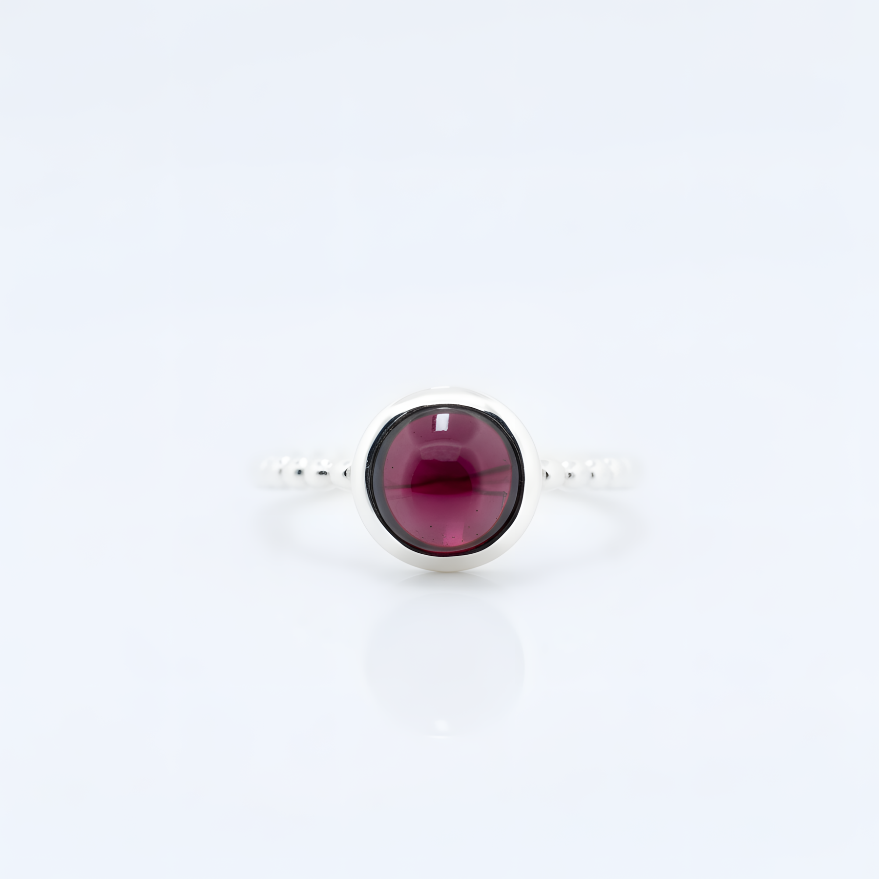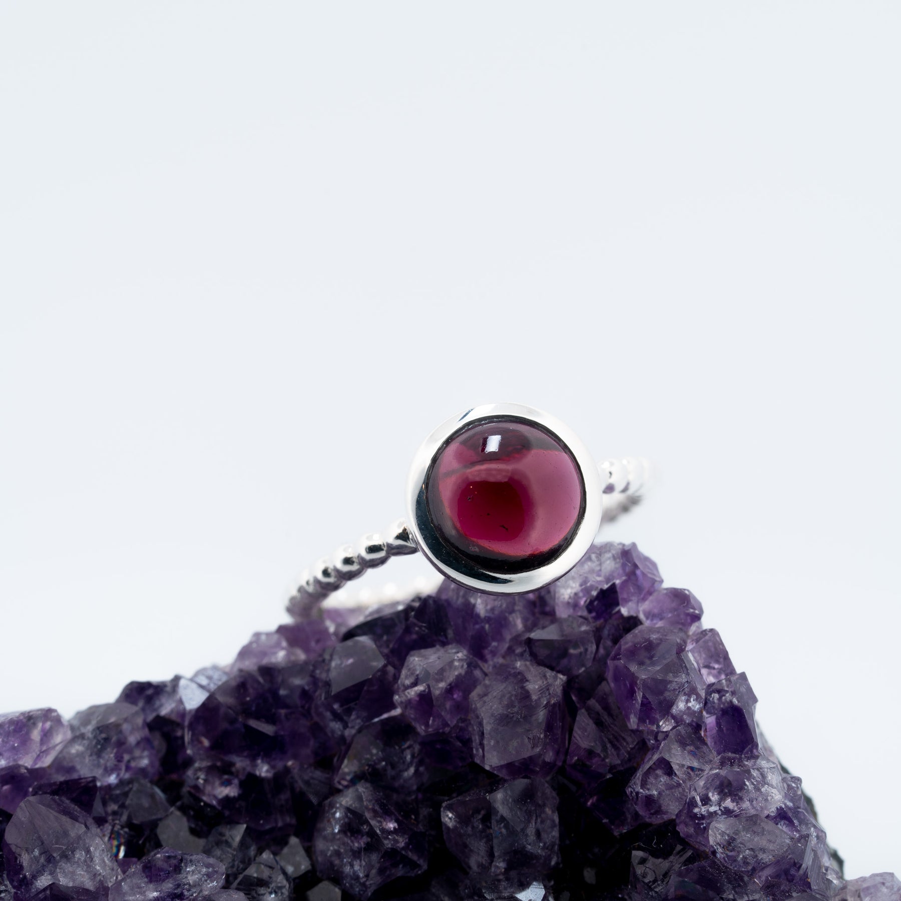 Almandino granatas nuo senų laikų buvo laikomas gyvybės ir atkūrimo akmeniu. Jis suteikia tvirtumo, padeda išlaikyti vidinį balansą ir saugo nuo energijos išsekimo. Šis žiedas – tai ne tik papuošalas, bet ir simbolinis širdies plakimo aidėjimas, primenantis apie tikrąją aistrą gyventi.