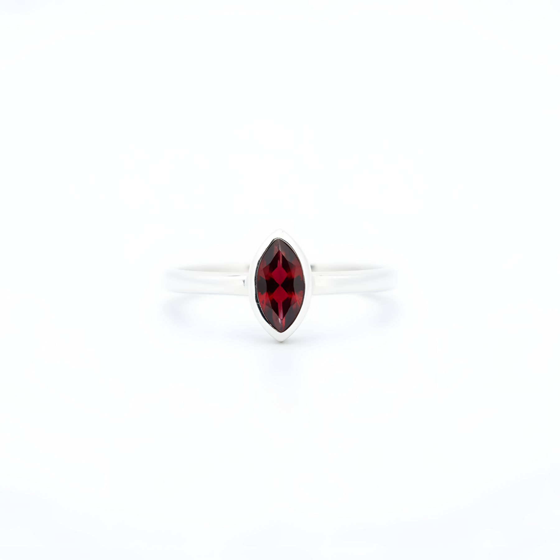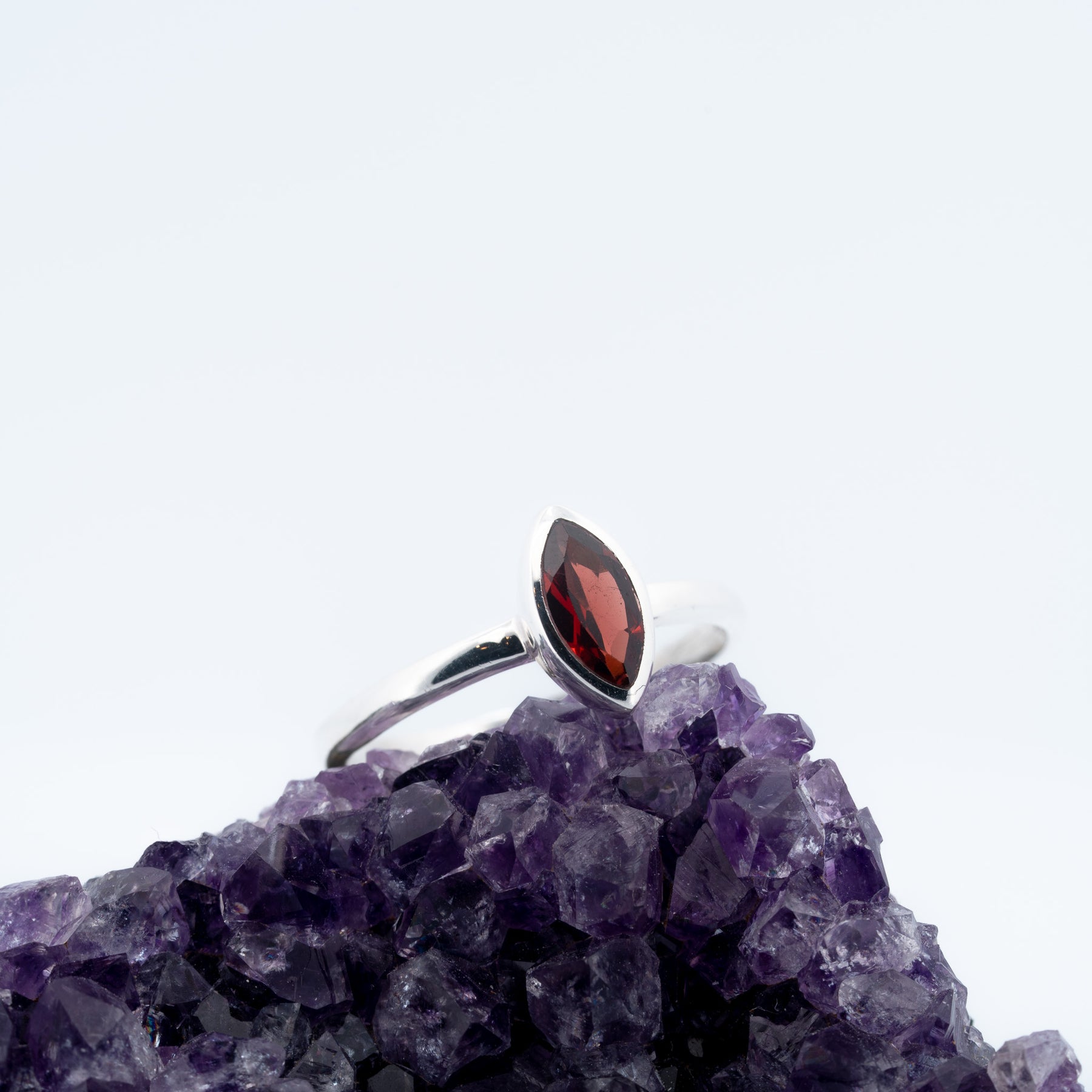 Nuo senų laikų granatas buvo laikomas apsaugos ir gyvybinės jėgos talismanu. Almandino atspalvis suteikia gylio ir brandos pojūtį – jis padeda išlaikyti pusiausvyrą tarp aistros ir ramybės, tarp žemės ir dvasios. Šis žiedas – tarsi tyli jėga, kurios nereikia įrodyti.