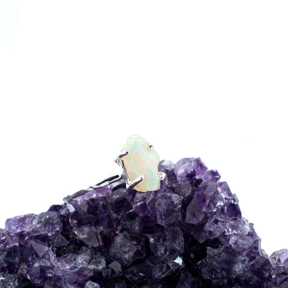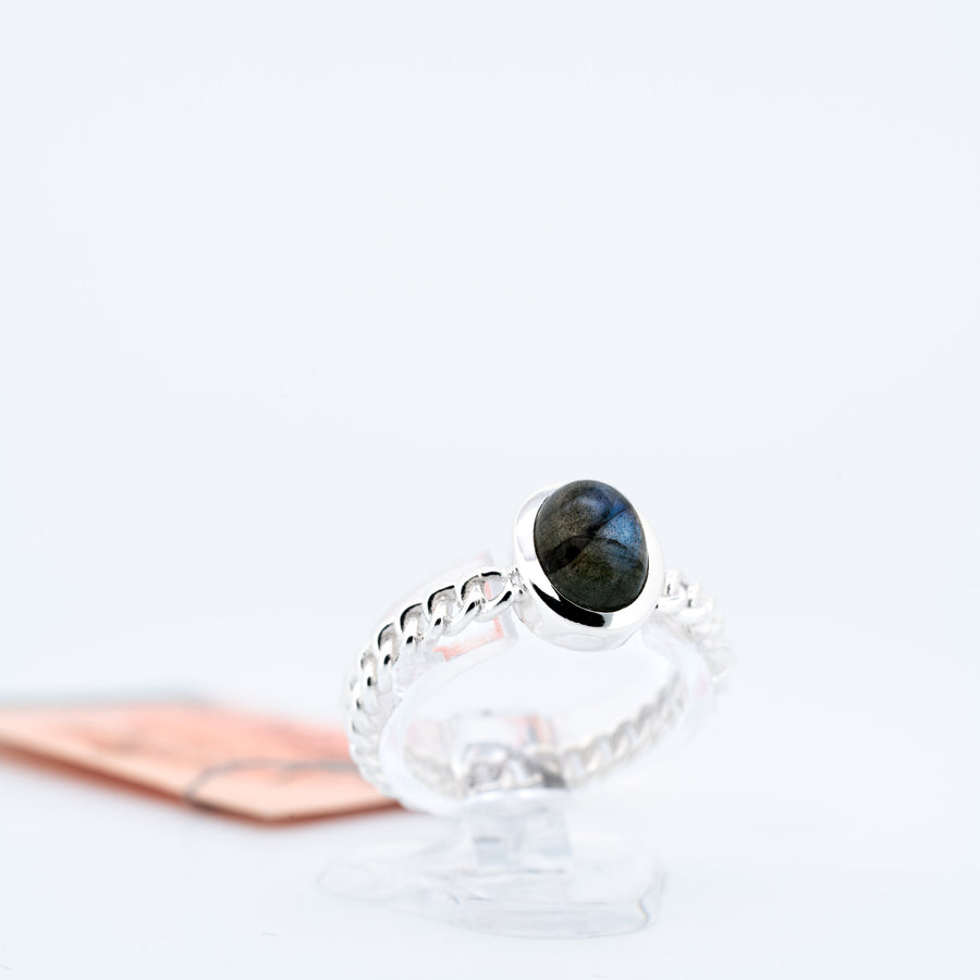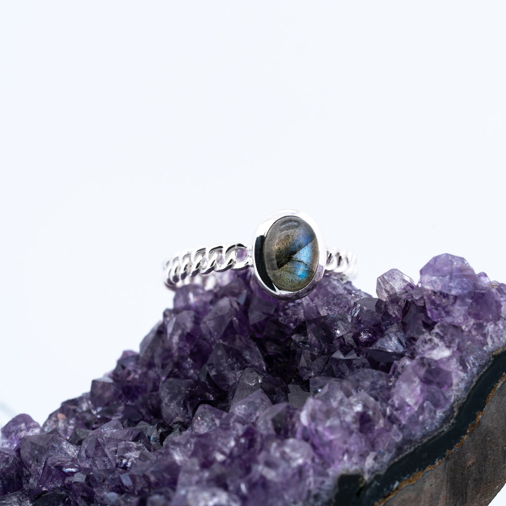 Šis žiedas su labradoritu – tylus, bet gyvas. Jo žalsvai mėlynas švytėjimas kuria iliuziją, kad laike atsiveria kažkas daugiau: intuicija, apsauga, dvasinis ryšys. Labradoritas nuo seno laikytas šamanų, keliautojų ir svajotojų akmeniu – vedliu per vidines ir išorines erdves.