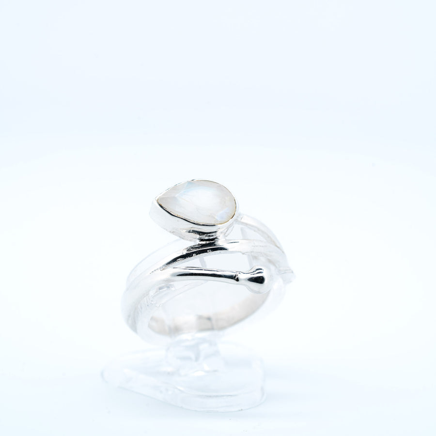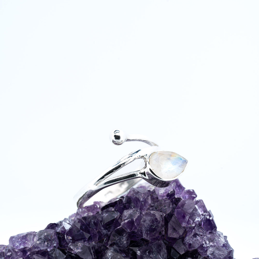 Švelnus, bet gilus – šis žiedas išsiskiria mistišku mėnulio akmens spindesiu ir organiška, gamtos įkvėpta forma. Jo vingiuojantis sidabrinis siluetas primena mėnulio šviesos taką – tai sielos ramybės, moteriškos intuicijos ir vidinio jautrumo simbolis.