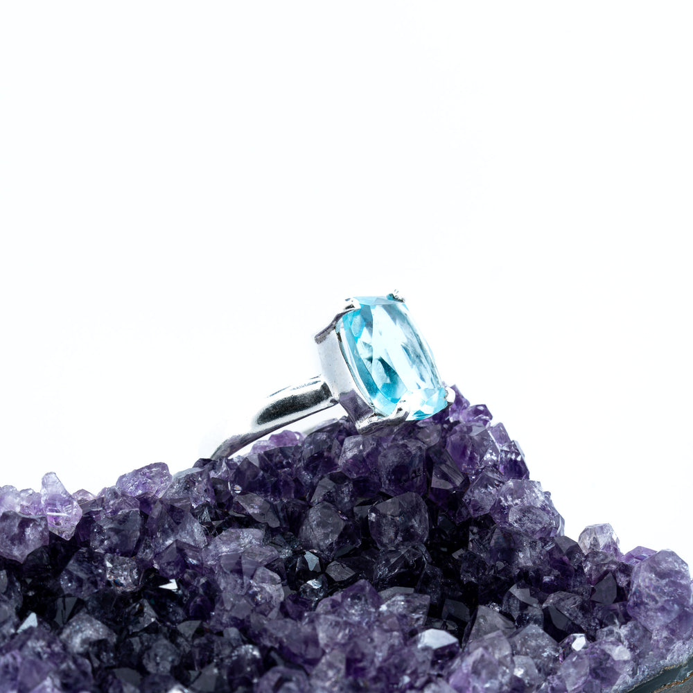 Šis žiedas su topazu – tarsi langas į giedrą, begalinį dangų. Skaidrus, melsvai žėrintis akmuo įkūnija ramybę, aiškumą ir išlaisvinančią minčių šviesą. Tai žiedas tiems, kurie ieško įkvėpimo, drąsos kalbėti tiesą ir gyventi iš širdies.