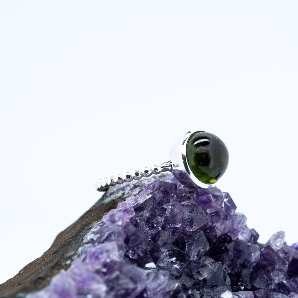 Verdelitas siejamas su širdies čakros atvėrimu, nuoširdumu ir augimo energija. Sakoma, kad jis palaiko vidinę pusiausvyrą, skatina atjautą ir padeda auginti pasitikėjimą – tiek savimi, tiek pasauliu. Burbuliukų formos sidabrinis žiedo lankelis suteikia kūriniui žaismingumo ir išskirtinumo, o apvalus akmuo – tarsi gamtos lašas, kupinas energijos.