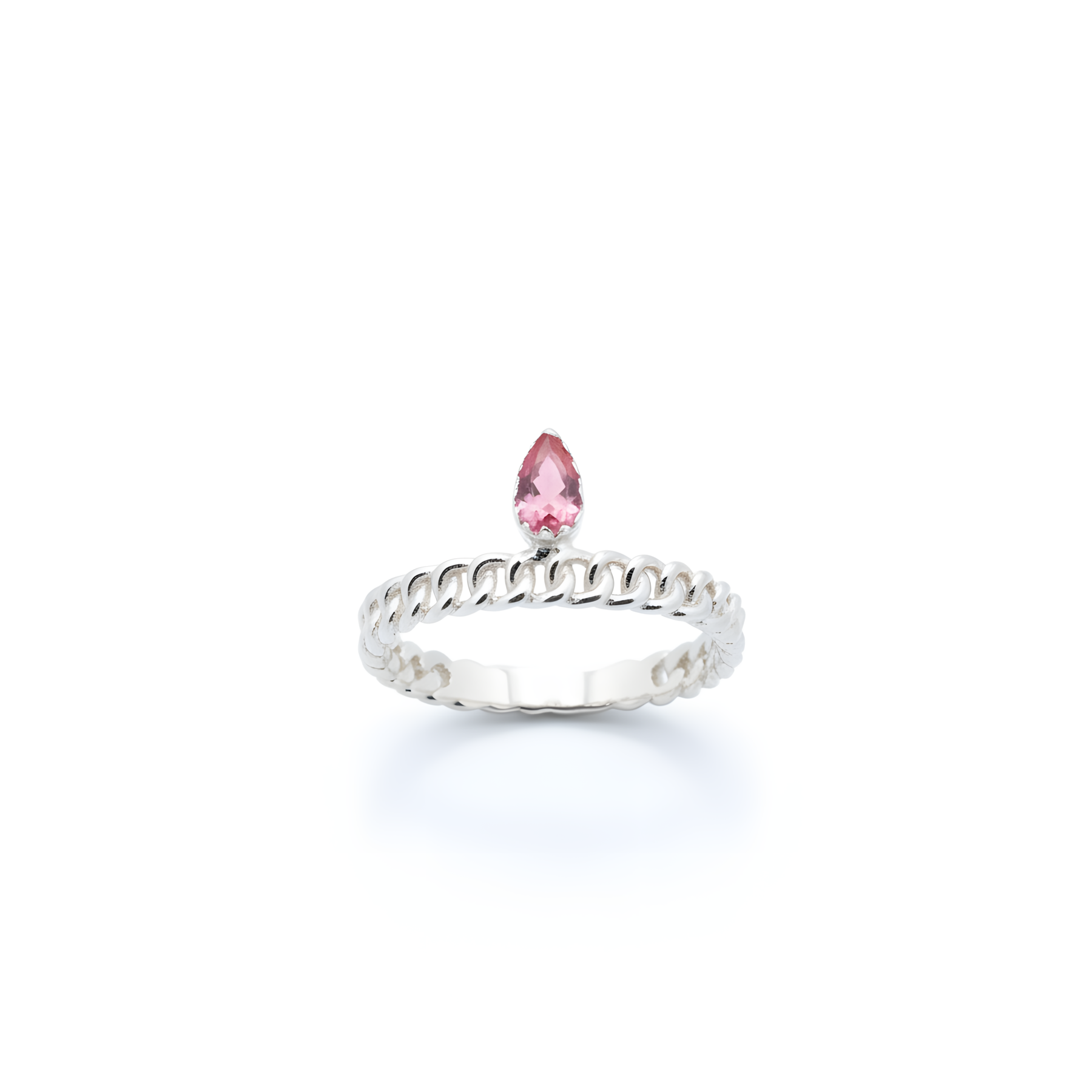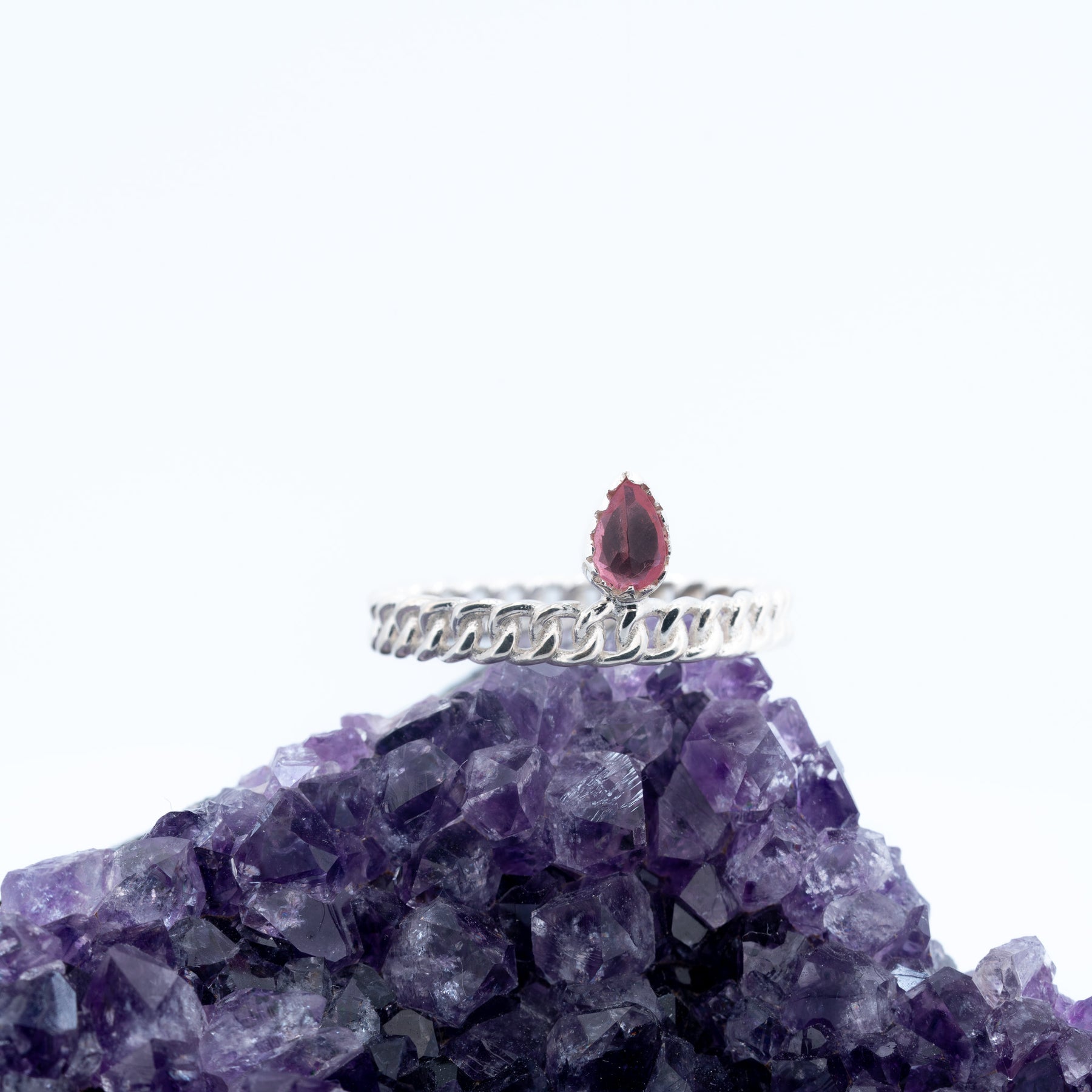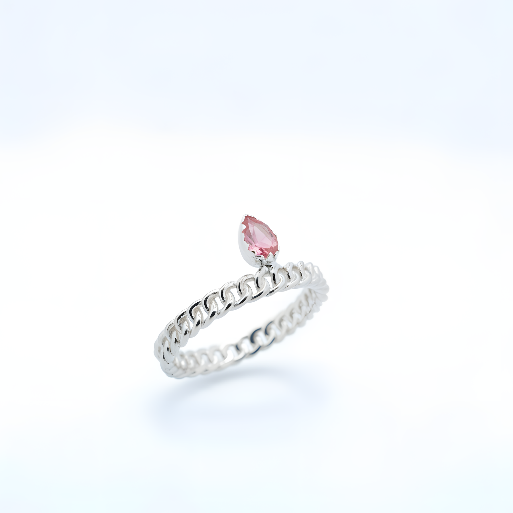 Rožinis turmalinas – tai švelnumo ir drąsos susitikimas. Kriaušės formos akmuo spindi lyg rožės lašelis, o pintas sidabro žiedelis suteikia lengvo, bet tvirto ritmo. Žiedas, kuris nešioja šilumą arti širdies.