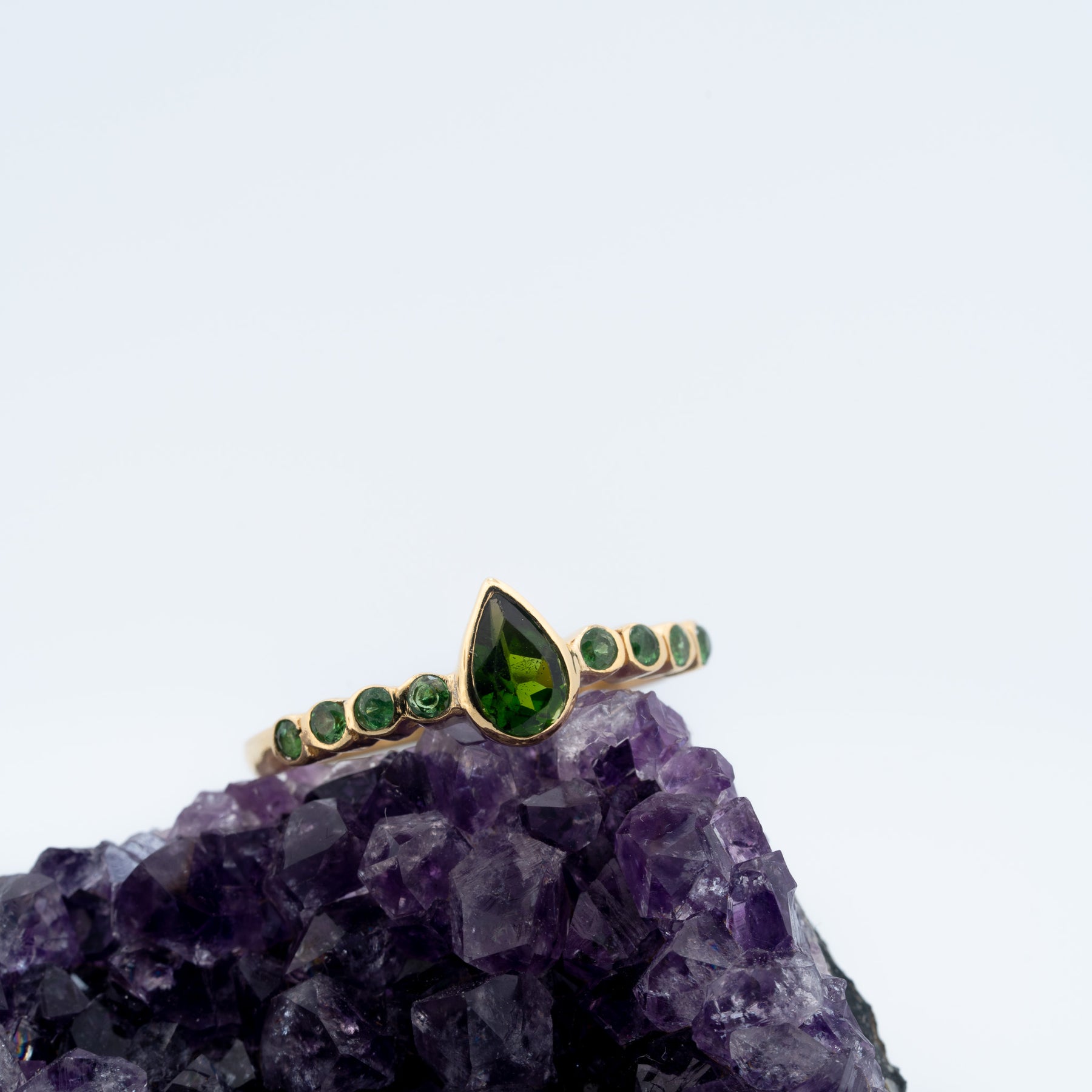 Gilus, sodriai žalias chromo diopsidas šiame žiede alsuoja pačios Žemės jėga. Jo spalva primena miško širdį po lietaus - drėgną, gyvą, pilną tyliai pulsuojančios energijos. Tai akmuo, kuris skatina vidinę pusiausvyrą, empatiją ir gebėjimą matyti grožį paprastume.