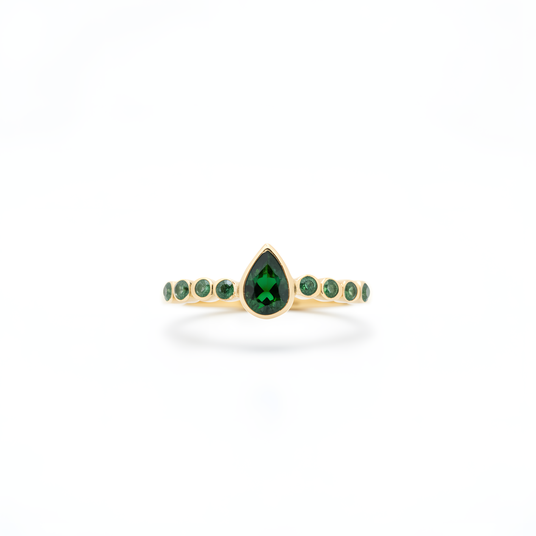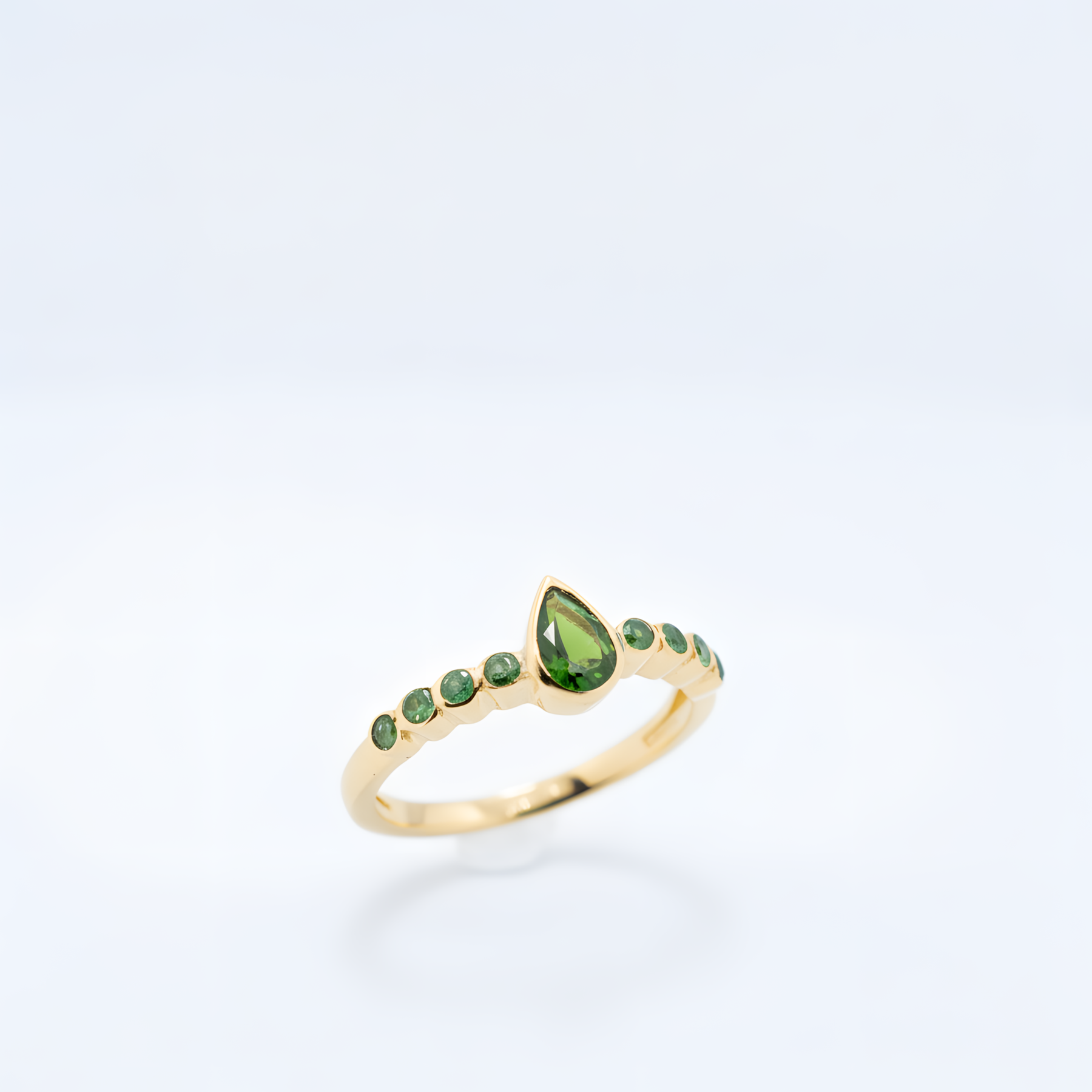 Chromo diopsidas vadinamas „širdies čakros akmeniu“ - jis atveria švelnumui ir atjautai, padeda paleisti senus emocinius šešėlius bei atkuria natūralų ryšį su gamtos ritmu. Auksinis žiedo atspalvis švelniai pabrėžia akmens gyvybingą žalumą, suteikdamas jam saulės spindesio ir elegantiško šilumos tono.