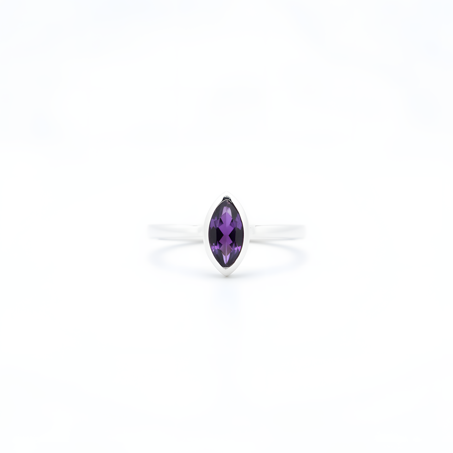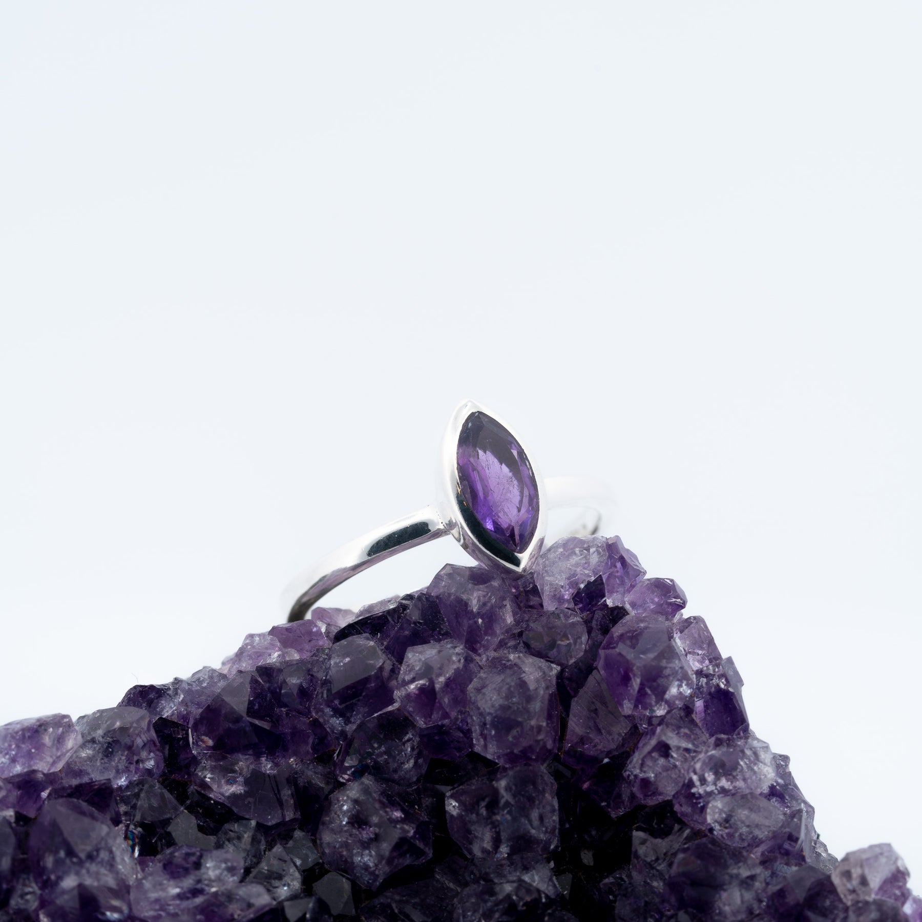 Nuo senų laikų ametistas buvo laikomas išminties ir dvasinio skaidrumo akmeniu. Jis saugo nuo chaoso, valo energiją ir stiprina intuiciją. Šis žiedas – kaip mažas portalas į tylą, kurioje viskas tampa aišku.