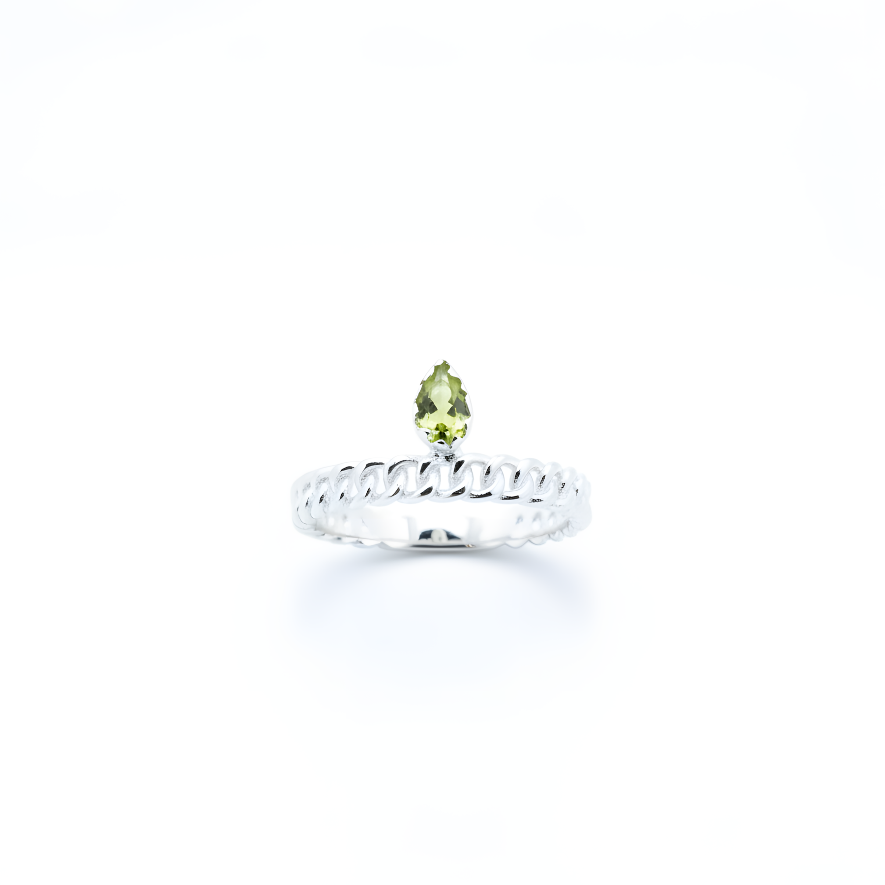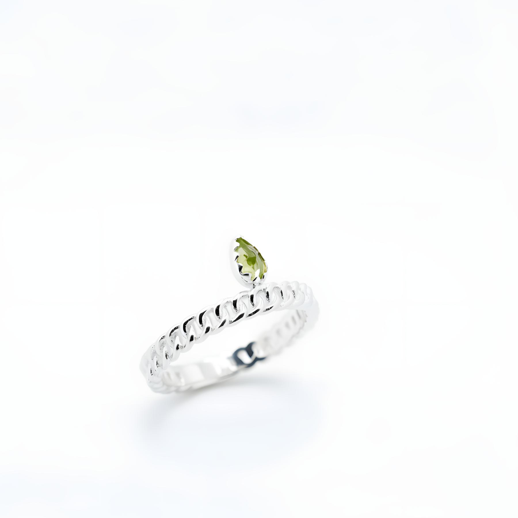 Peridotas nuo seniausių laikų laikomas saulės akmeniu – jis valo mintis, skleidžia optimizmą ir padeda atkurti vidinę harmoniją. Šis žiedas, savo grandinėlės formos juosta, simbolizuoja nenutrūkstamą energijos tėkmę ir dvasinį ryšį tarp žmogaus ir gamtos.