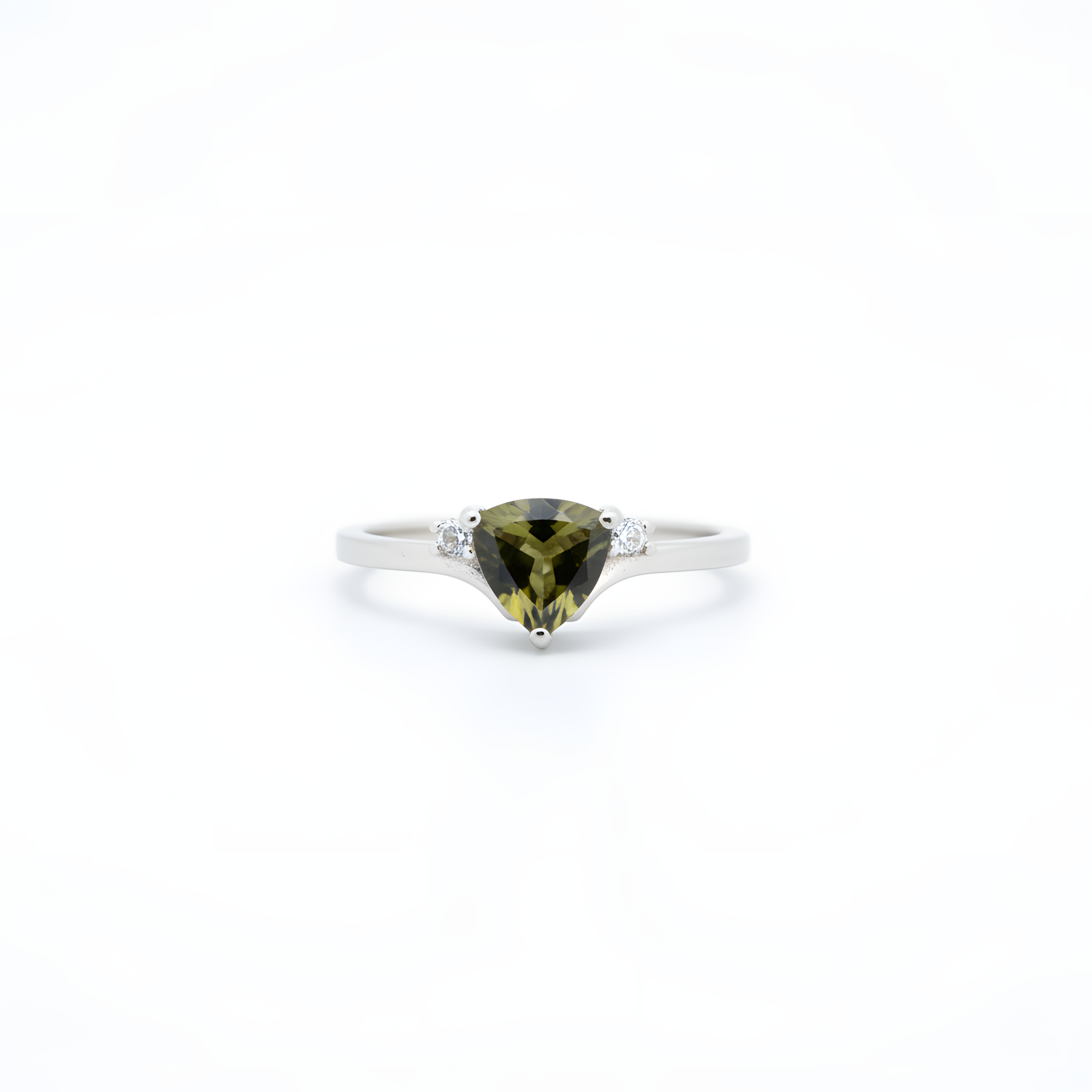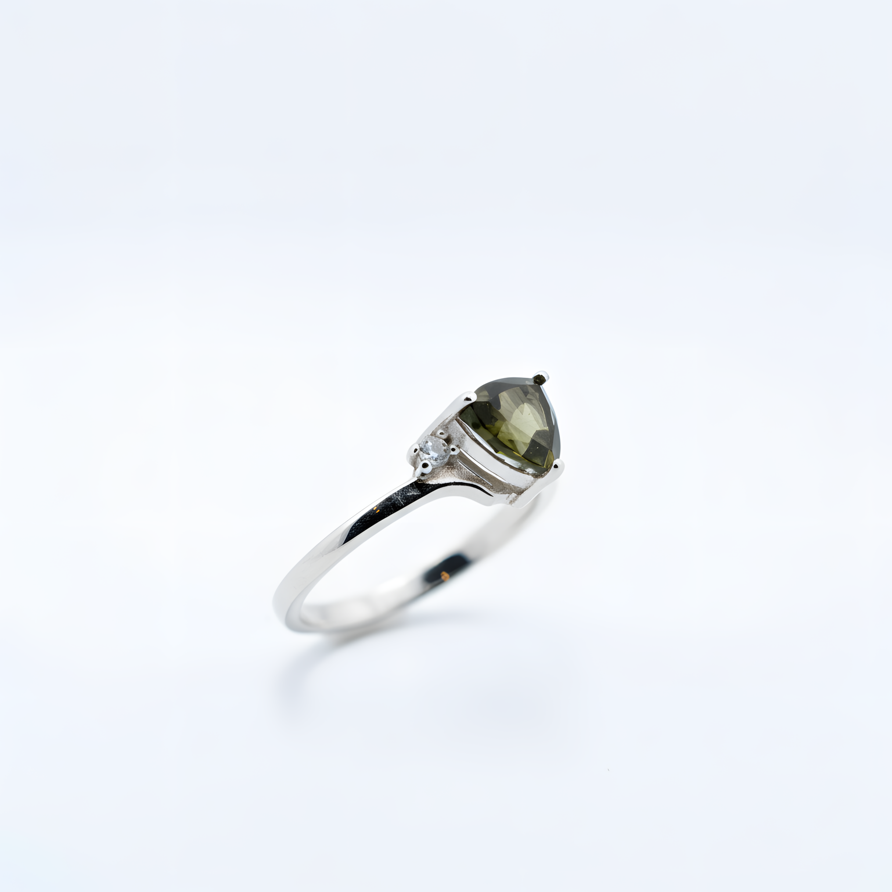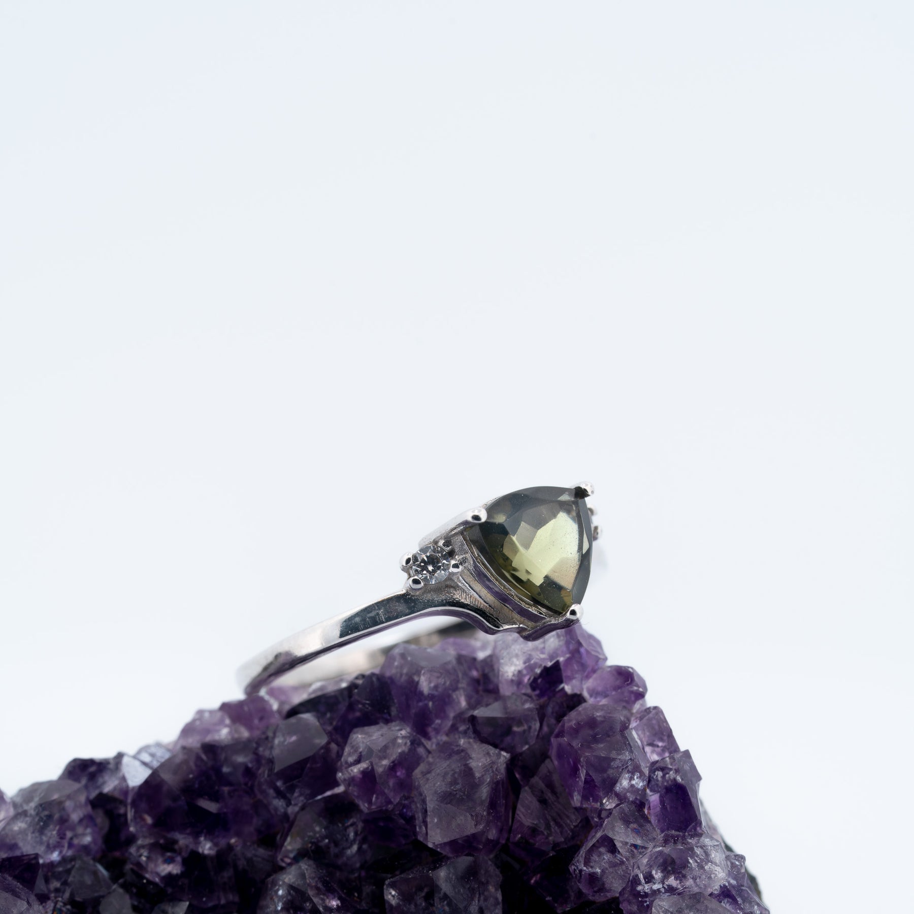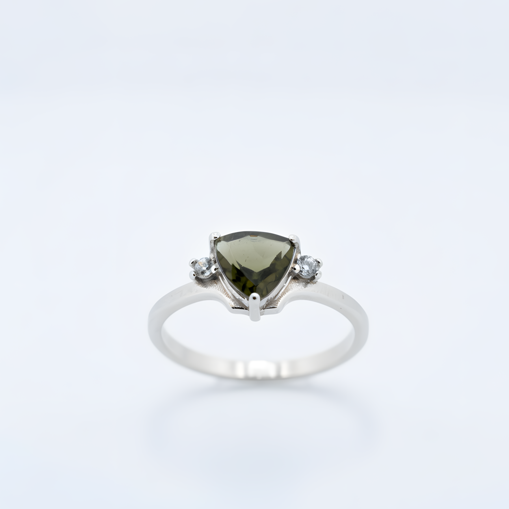 Šio žiedo centrinis moldavitas spindi tarsi lašo formos reliktas iš kitos pasaulio pradžios, o šalia esantys cirkoniai simbolizuoja aiškumą ir šviesos grynumą. Subtilus dizainas iš 925 prabos sidabro išlaiko eleganciją, o trikampio akmens forma primena balansą tarp kūno, proto ir dvasios.
