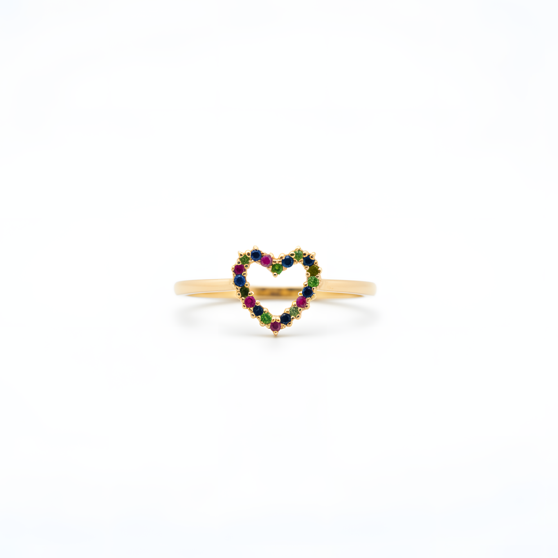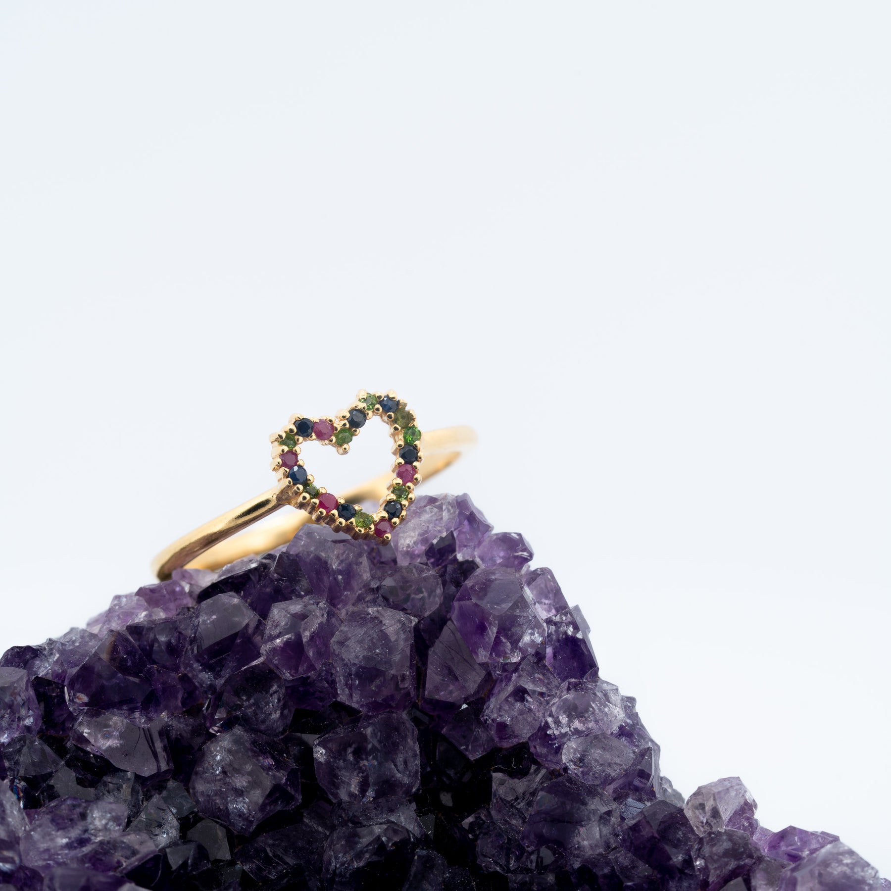 Širdies formos dizainas, nusagstytas įvairiaspalviais brangakmeniais, spindi kaip mažytė vaivorykštė ant jūsų rankos. Mėlyni safyrai simbolizuoja ramybę ir ištikimybę, rožiniai safyrai, meilę ir švelnumą, o žali tsavoritai, gyvybingumą ir atsinaujinimą.