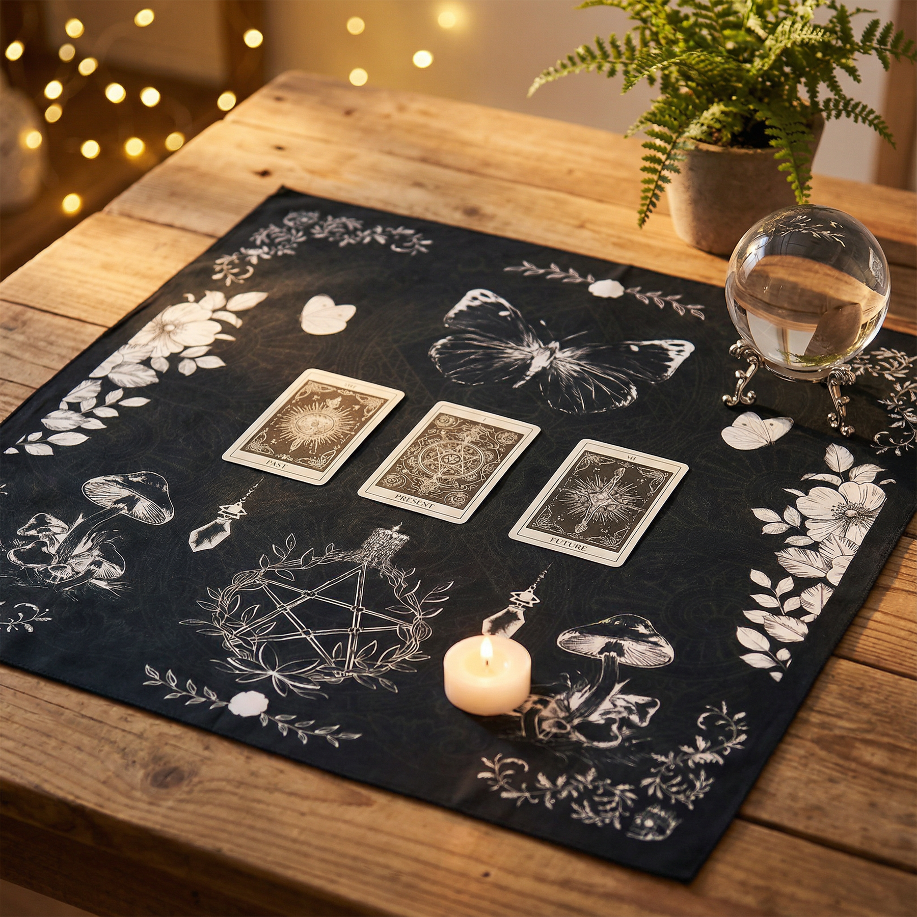 Centrinis drugelis simbolizuoja transformaciją ir vidinį virsmą, žiedai ir lapai suteikia švelnumo, o grybų motyvai įveda į žemės magijos ir intuicijos paslaptis. „Past – Present – Future“ išdėstymas leidžia atlikti greitą ir aiškų trijų kortų skaitymą, todėl užtiesalas tinka tiek pradedantiesiems, tiek patyrusiems praktikams.