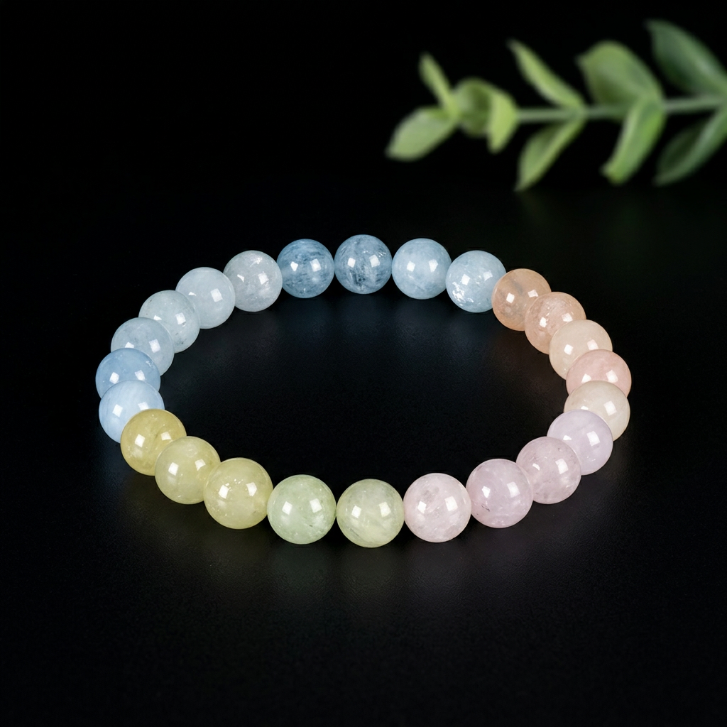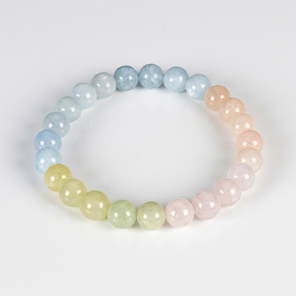 Į savo gyvenimą įsileiskite užuojautą, meilę ir pasitikėjimą savimi. Šia triguba mišrių berilų apyrankę sudaro švelniai rausvas morganitas, melsvas akvamarinas ir geltonai žalias heliodoras.