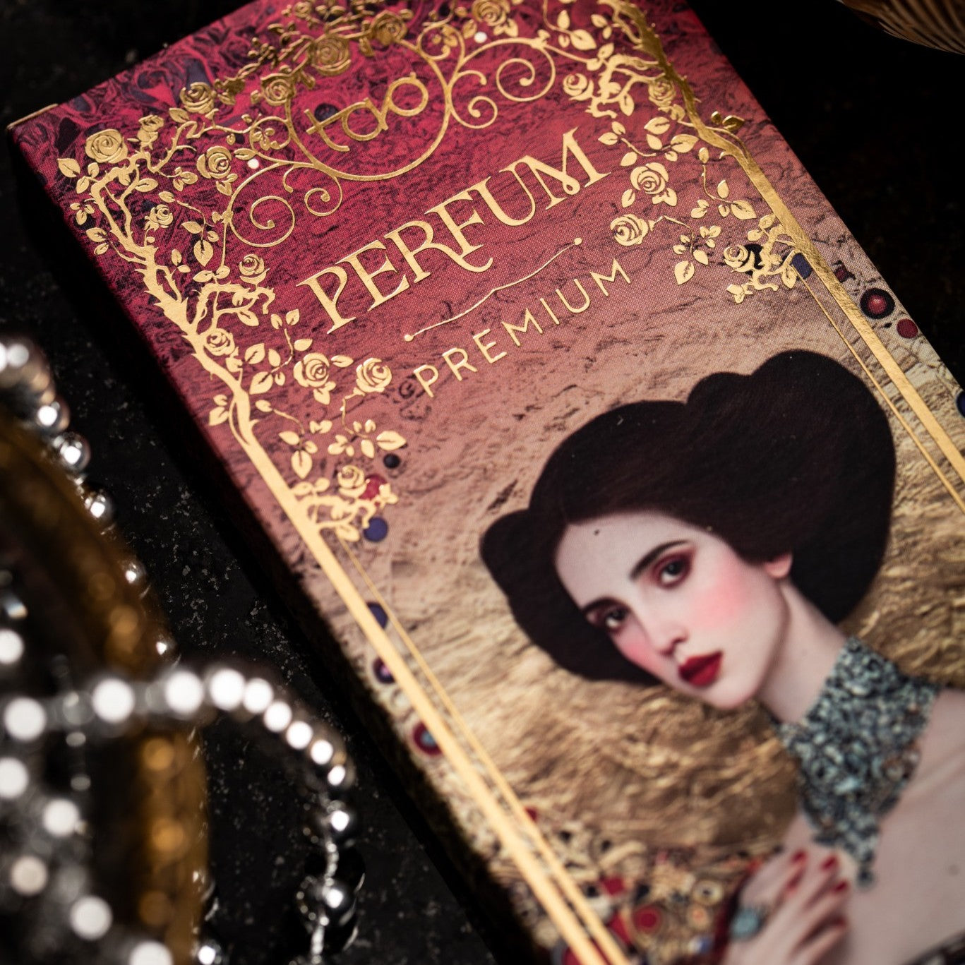 Ant pakuotės pavaizduota dama su karališka laikysena ir sodriomis raudono bei aukso spalvomis. Jos apranga ir papuošalai spindi prabanga, simbolizuodami dvasingumo kilnumą ir vidinę šviesą. Ji įkūnija aromato aurą – karališką, tyrą ir pakylėjančią.