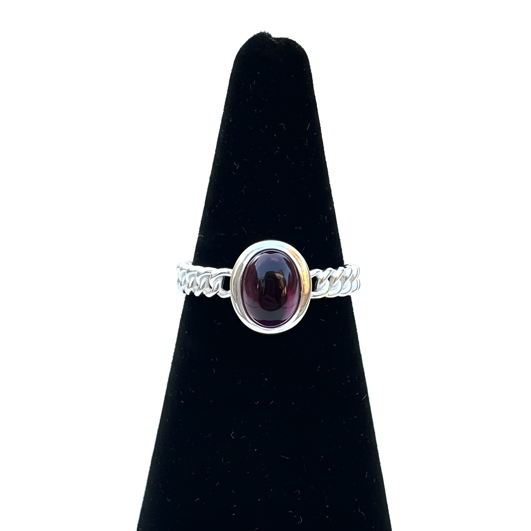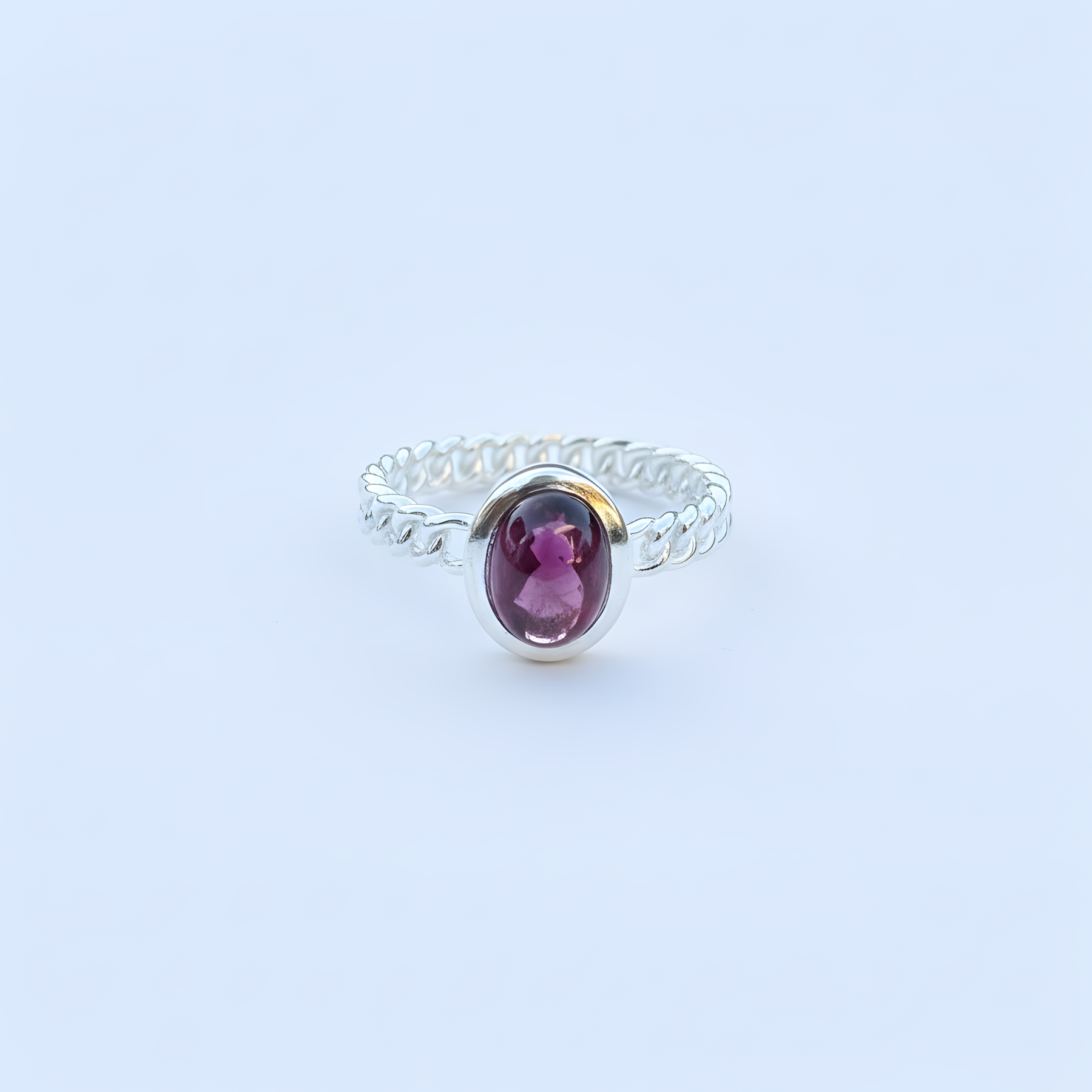 Šis žiedas su natūraliu granatu alsuoja šiluma ir jėga, tarsi mažas liepsnos lašas sidabro glėbyje. Jo sodri raudona spalva primena vidinę ugnį, kuri kuria, įkvepia ir saugo. Granatas laikomas drąsos ir atkūrimo akmeniu, jis stiprina gyvybingumą, padeda išlaikyti emocinį stabilumą bei atgaivina pasitikėjimą savimi.